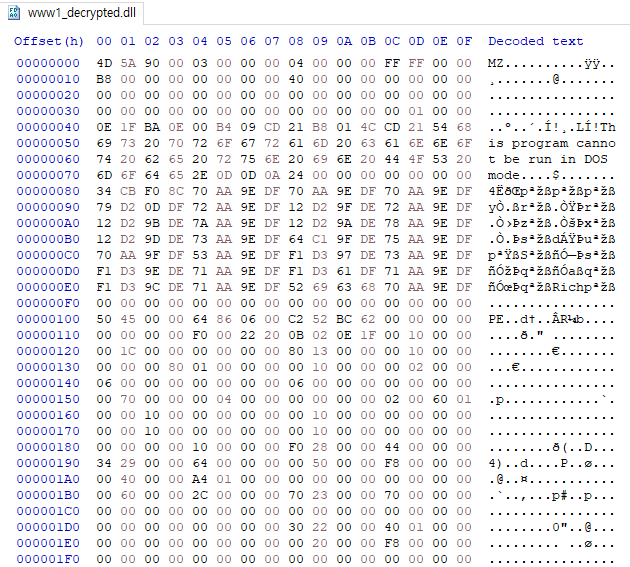 뭔가 잘못된 dll 파일을 가져왔다는 듯이 말하고 있습니다. 그럼 www4.dll 파일을 가져와서 XOR 해서 내용물을 다시 IDA로 열어서 보도록 하겠습니다.