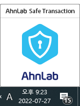 들어가보면 위와 같이 나오는데요. 그리고 만약 본인 PC에 Ahnlab Safe Transaction 프로그램이 설치되어 있다면 우측 하단에 이런 모양도 같이 나올겁니다.