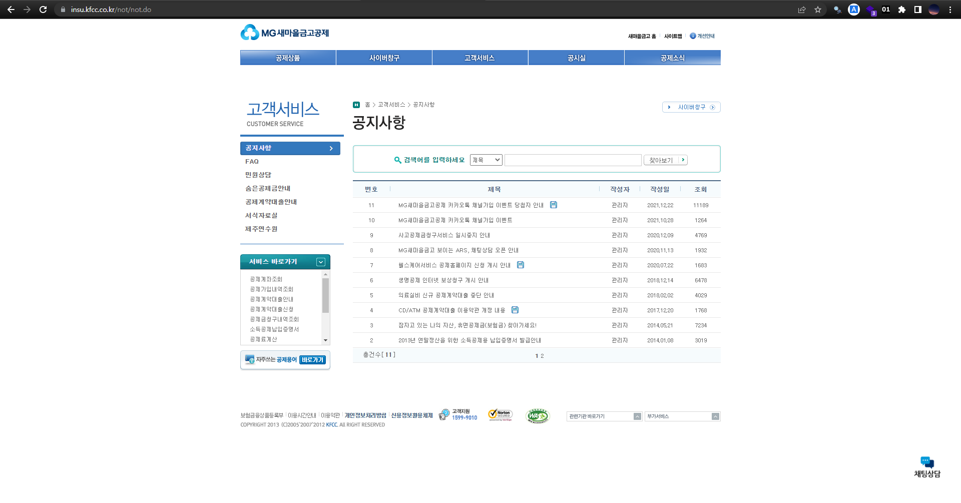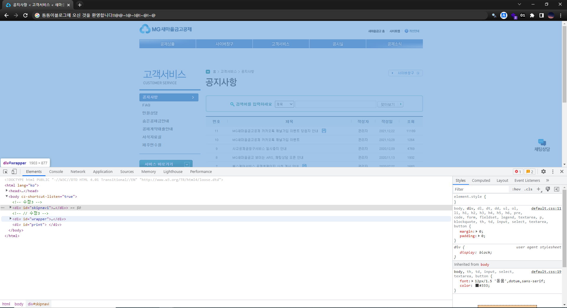 우선 제가 주로 크롤러 개발의 대상으로 사용하는 금융권 사이트 중 하나인 새마을금고의 공지사항 페이지를 접속해보겠습니다.
