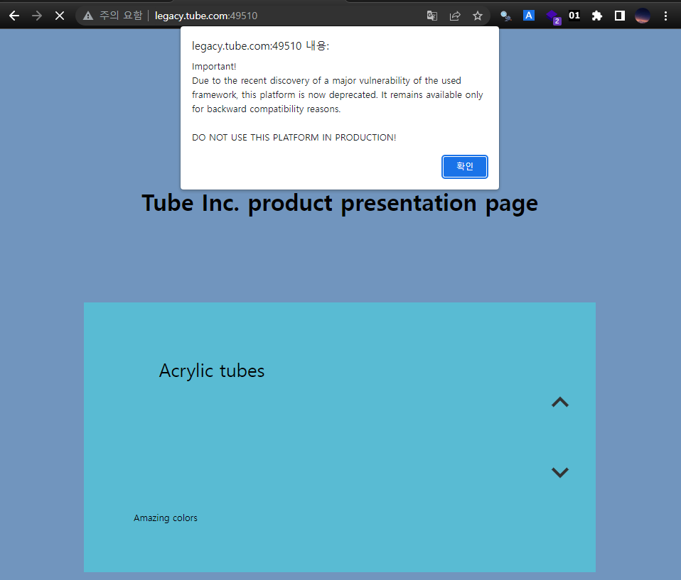 그랬더니 뭔가 이전의 페이지와는 다르게 alert 창이 뜨면서 뭐라뭐라하고 있습니다.