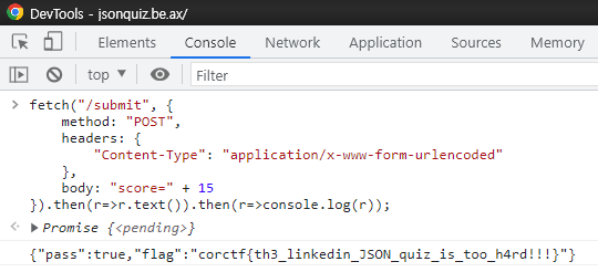 그리고 /submit URL 경로로 POST 방식으로 score 파라미터를 전송하고 있는데, 단순히 0 값으로 초기화해서 보내고 있는 것을 알 수 있습니다. Client 단 코드를 보면 문제 1개당 배점이 별도로 존재하고 있지는 않는 것 같아서 그냥 문제 개수대로 score 를 15로 설정하고 전송해보았습니다.