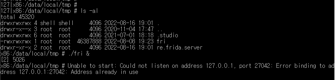 해당 오류가 나는 이유는 이미 frida server가 실행되어있을 경우 나는 오류입니다. 이미 frida server 에서 사용하고 있는 포트번호인 27042 가 이미 사용되고 있다는 뜻인데, adb 환경에서 왠만하면 다른 프로그램이 해당 포트를 점유하고 있을 가능성은 적기 때문에 아마 이미 frida server 가 실행되고 있을 가능성이 높습니다.