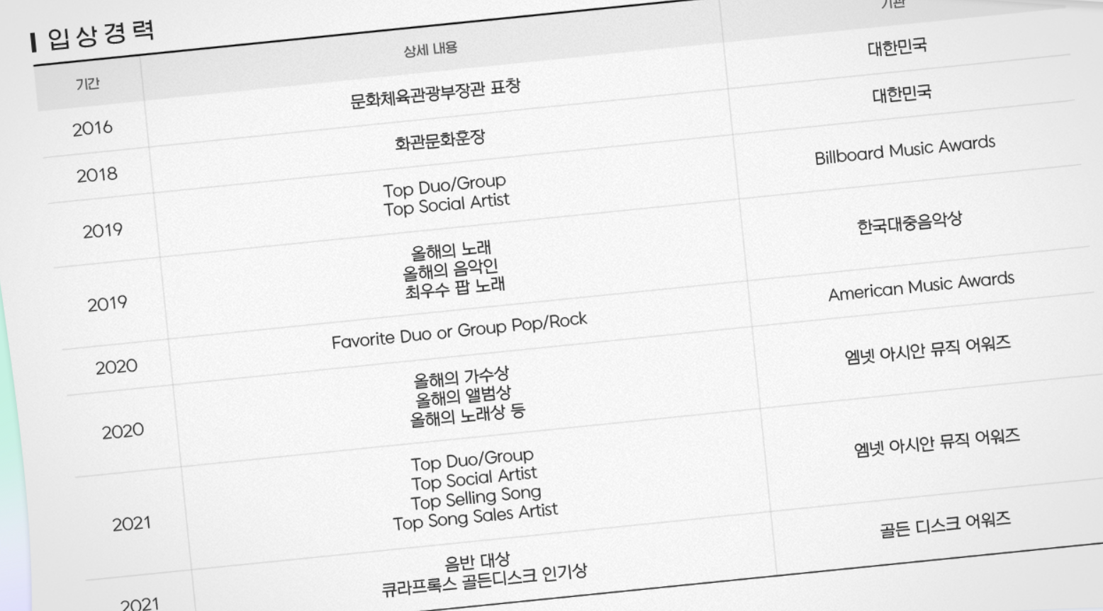 무슨 이력서 입상경력이 꽉꽉 채워져있고 빌보드, 아메리칸 뮤직어워즈가 있냐구요