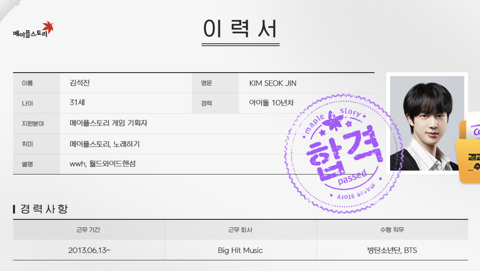 메이플할라고 로그인하러 들어갔는데 갑자기 출근용사 김석진이 떠있는거에요