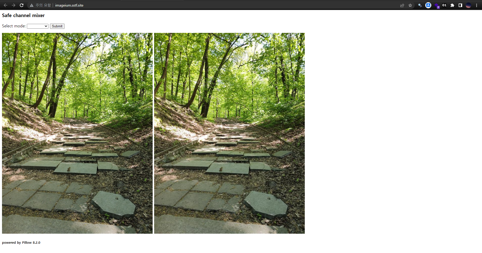 문제 사이트에 접속해보면 위와 같은 페이지를 볼 수 있습니다. Select mode 부분에 select box 로 선택할 수 있고, Submit 버튼을 눌러 서버에 전송할 수 있는 것 같습니다. 또 하단에는 powered by Pillow 8.2.0 으로 힌트를 주고 있는 듯하네요.