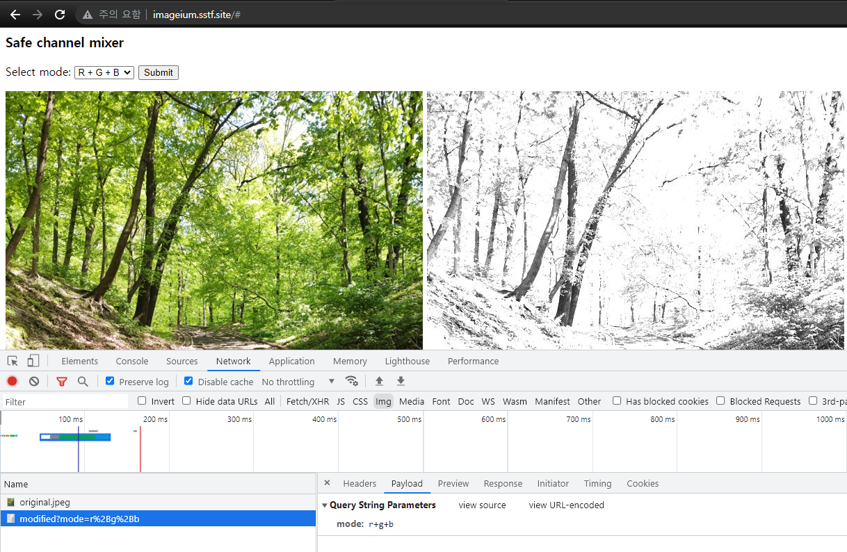 R+G+B 모드를 선택하고 Submit 버튼을 눌렀을 때 modified 라는 경로로 mode 파라미터와 함께 전송되는 것을 볼 수 있었습니다. 그리고 그 결과로 바로 우측의 RGB 색상이 변환된 이미지가 나오는 것을 볼 수 있었습니다.