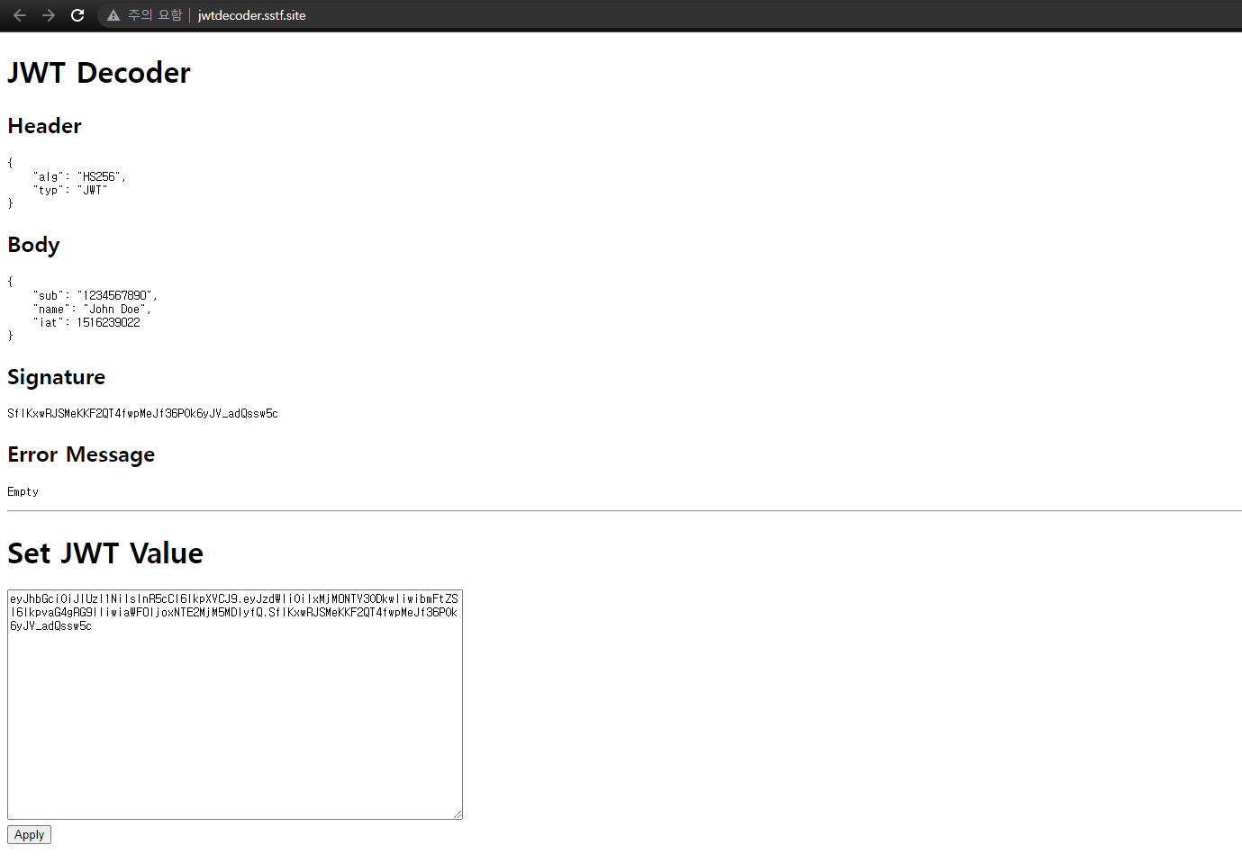 문제를 처음 들어가보면 위와 같이 JWT 토큰을 입력폼에 입력하구서 Apply 버튼을 누르면 delimiter 를 기준으로 base64 디코딩 후 JSON.stringify 해서 보여주는 기능을 가지고 있습니다. Signareture는 그냥 그대로 출력합니다.