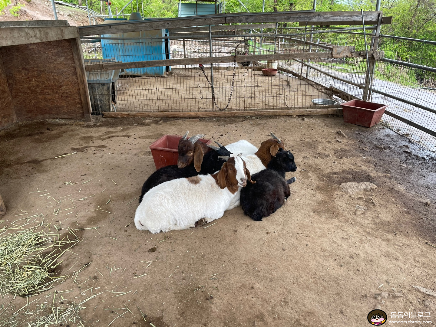 그렇게 우리나라 지도처럼 생긴 강 앞에서 사진도 많이 찍고, 앉아있다가, 점심시간 즈음에 다시 아래로 내려왔는데 염소들이 한군데 뭉쳐서 자고있었어요. ㅋㅋㅋ귀여워요. 염소는 저렇게 서로의 등에 기대서 자는군요!