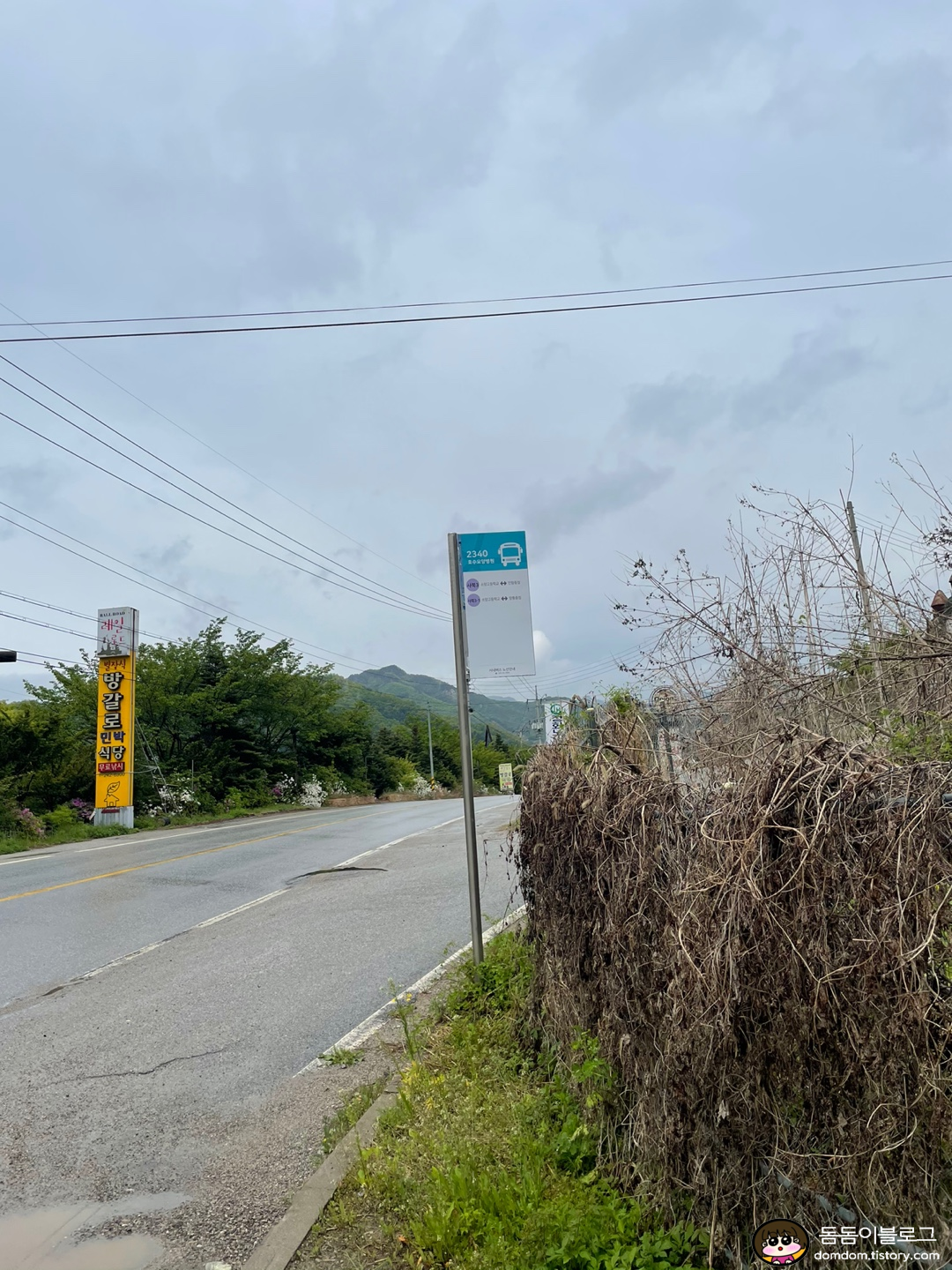 아래보이는 표지판이 버스정류장이에요.. 도로한복판에 표지판 딸랑 하나. 산속이라, 차가 많이 안온다고 하지만 조금.. 음.... 사람이 버스를 잘 기다리며 대기탈수있게 버스정류장을 새로 만들어야하지 않을까....싶습니다..!