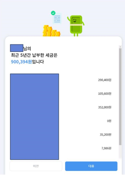 그리고 다음 버튼을 누르면, 가장 많이 받은 소득이 나오고, 그 다음으로는 최근 5년 간 납부한 세금 목록이 쭉 나와요!