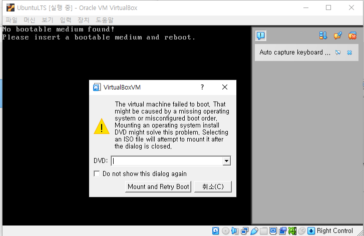 생성한 우분투 가상머신을 실행하면 아래와같은 팝업창이 나오는데요,
