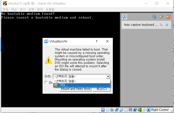기타를 눌러서 다운로드받았던 우분투 데스크탑 iso 파일을 선택하고, Mount and Retry Boot을 눌러줍니다.