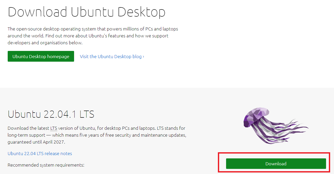 스크롤을 좀 내리면 Ubuntu 22.04.1 LTS가 있고 우측에 Download 버튼이 있습니다.