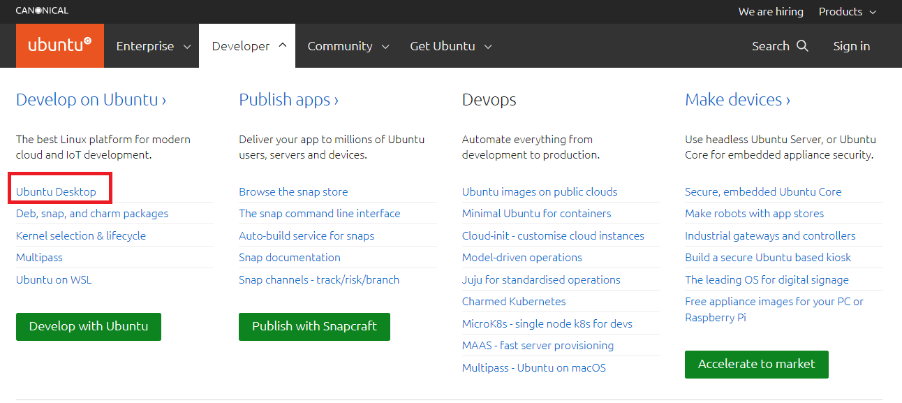 위 우분투 홈페이지에 들어가서 상단메뉴 Developer > Ubuntu Desktop를 눌러주세요