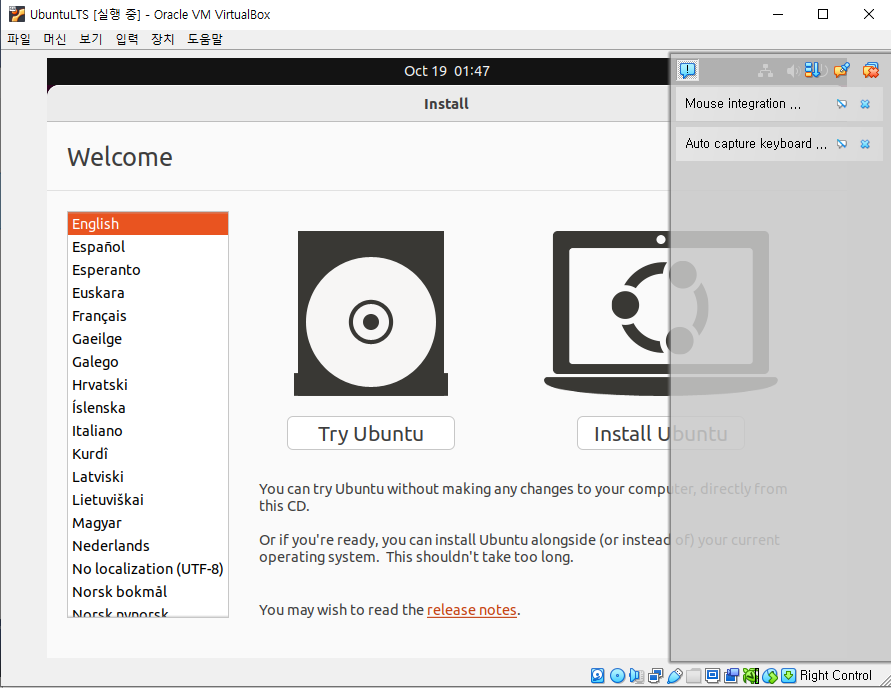 아래와 같이 우분투를 설치할 수 있는 화면이 나옵니다.