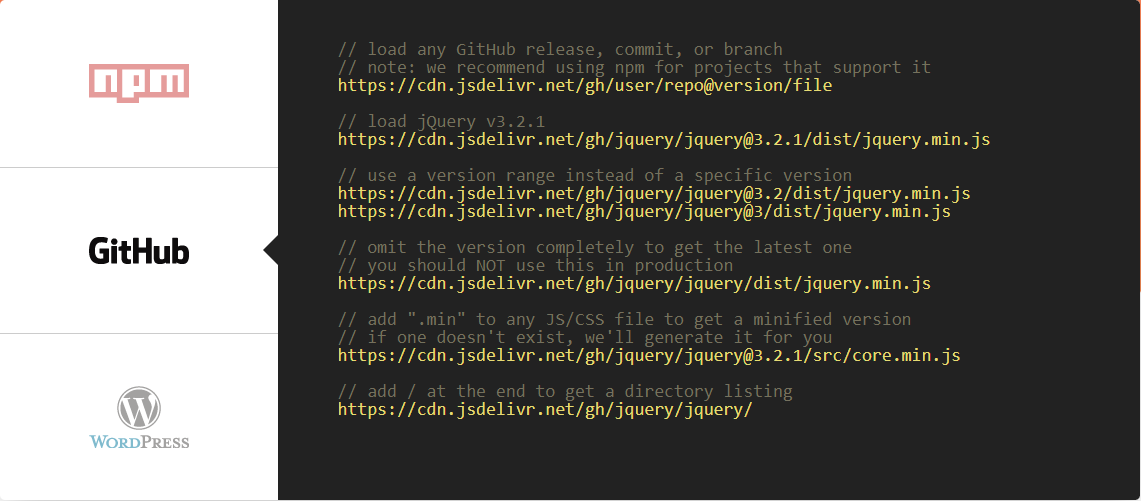 Supports npm, GitHub, WordPress, Deno, and more. Largest network and best performance among all CDNs. Serving more than 80 billion requests per month. Built for production use.