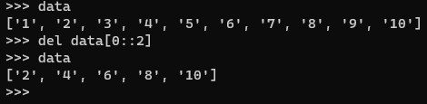 del data[0::2] (0번째 인덱스부터, 2만큼의 간격마다 삭제)를 해주면 됩니다