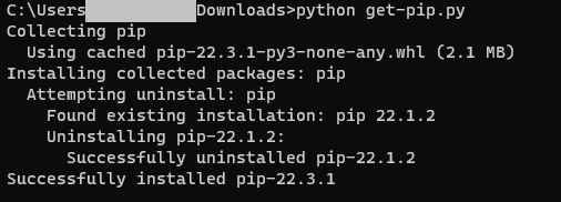 저장을 완료했다면 , cmd를 열어 아래와 같이 get-pip.py를 실행합니다.