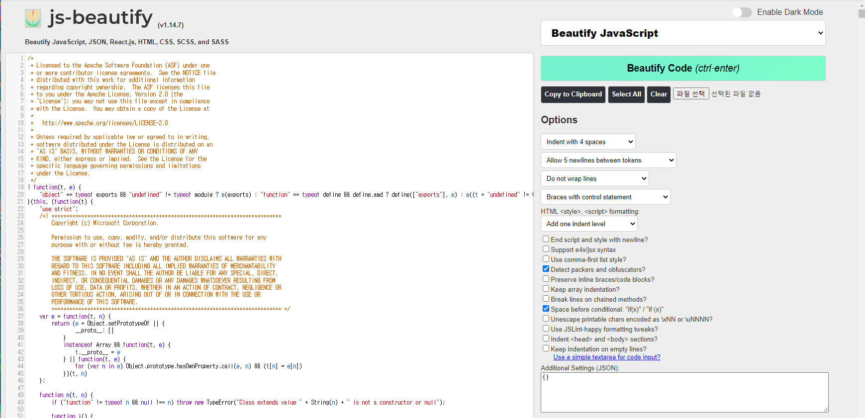 제가 사용한 사이트는 https://beautifier.io/ 입니다.
