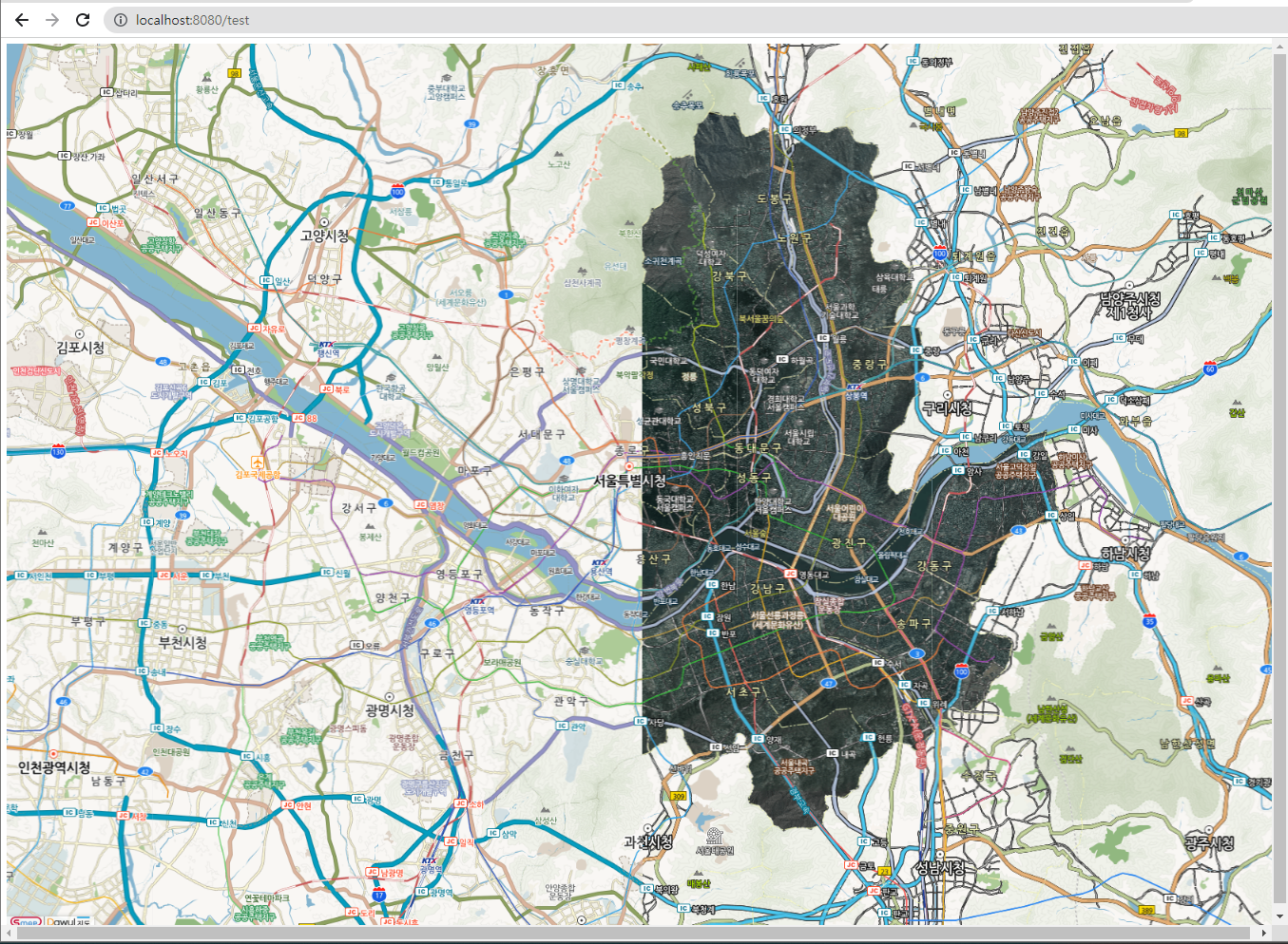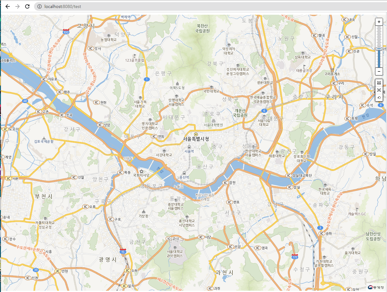 왼쪽에는 스마트서울맵의 기본타일(BASE_MAP_GEN)을, 오른쪽에는 스마트서울맵의 위성타일(BASE_MAP_SATE)을 넣어보았습니다.