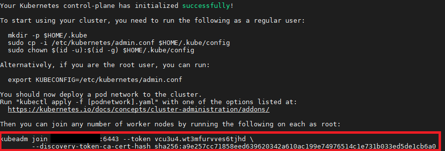 정상적으로 마스터 노드 초기화가 완료되었다면 아래와 같이 token 값을 받게 됩니다.