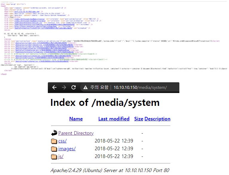 로그인은 했는데, 별다를 바가 없어서 한참 헤매다가 이상한 걸 발견했습니다. 아래는 메인페이지 소스코드의 head 부분인데, 여러 css, javascript 파일들이 나열되어 있었는데, /media/system 이란 것에 디렉토리 리스팅이 되는 걸 알았습니다.