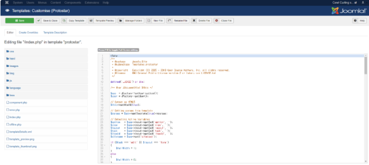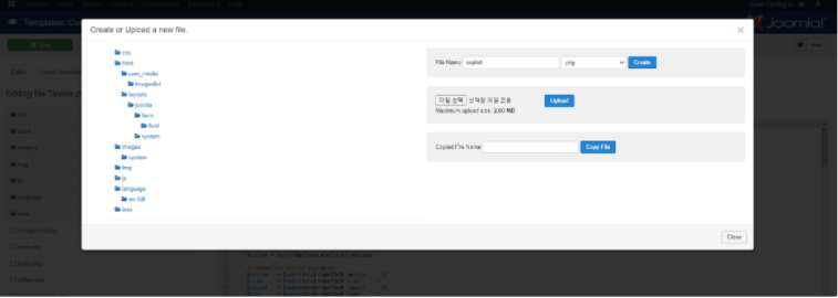 위 페이지는 웹사이트의 템플릿을 수정할 수 있는 기능이었습니다. 페이지의 소스코드를 직접 파일을 가져다가 수정할 수 있을 뿐만 아니라 New File 버튼을 눌러서 새로운 파일을 만들고 그 파일의 내용을 PHP 언어로 작성도 할 수 있었습니다. 참고로 템플릿은 총 2개가 있었는데, 웹페이지의 메인페이지의 소스코드를 보면 css template이 protostar이라고 되어 있는 걸보면, 현재 protostar이라는 템플릿이 적용되어 있는 걸 알 수 있습니다. 그래서 protostar의 페이지를 수정하거나 추가해서 사용하면 된다는 걸 알았습니다.