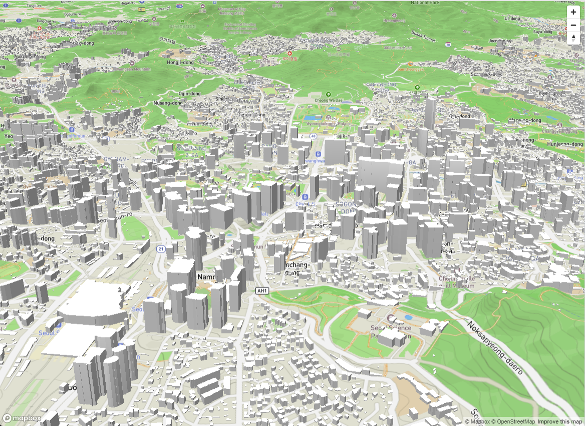 서울전체의 건물을 올려놓았지만, 벡터타일 형태이므로 속도가 아주 빠릅니다.