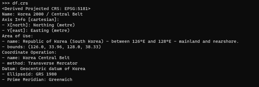 df.crs로 shp파일의 좌표계를 알 수 있습니다.
