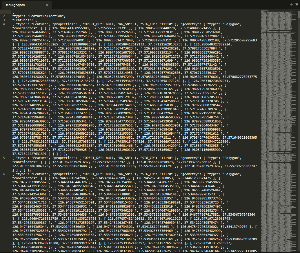 변환한 geojson파일을 열어보면 정상적으로 polygon들이 출력되는 것을 확인할 수 있습니다.