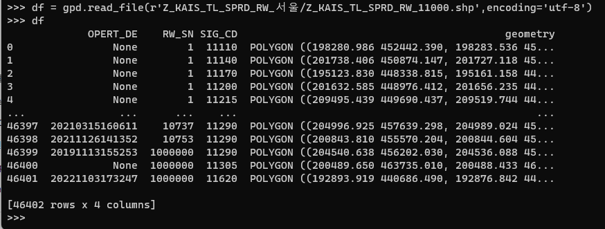df = gpd.read_file(r'Z_KAIS_TL_SPRD_RW_서울/Z_KAIS_TL_SPRD_RW_11000.shp',encoding='utf-8')