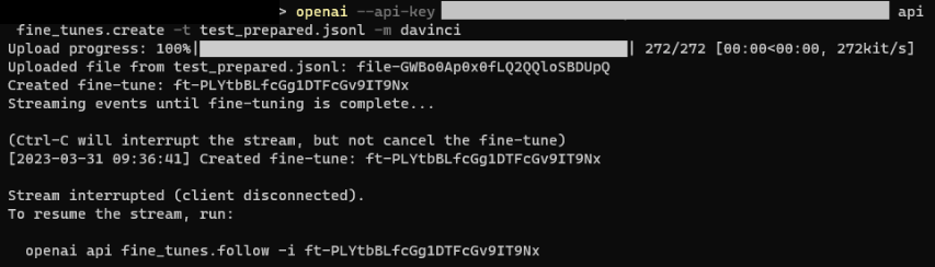 openai --api-key {인증키} api fine_tunes.create -t test_prepared.jsonl -m davinci