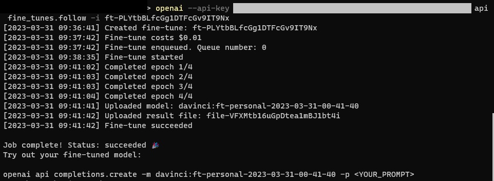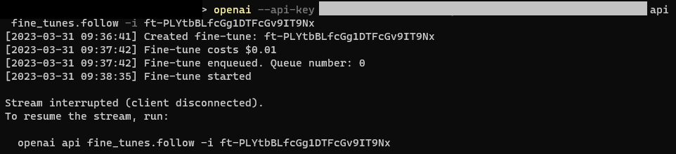 openai --api-key {인증키} api fine_tunes.follow -i ft-PLYtbBLfcGg1DTFcGv9IT9Nx