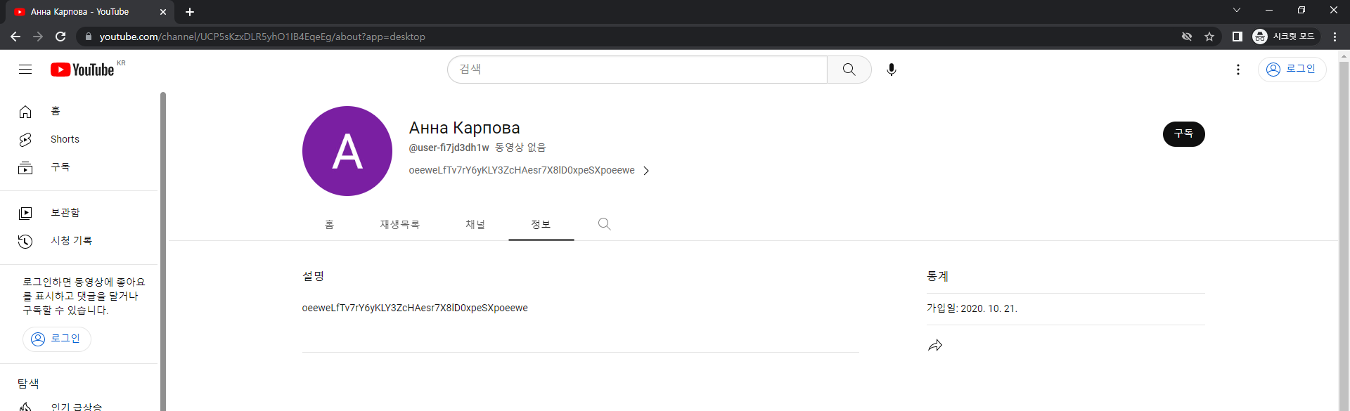 접속해보면 유투브 크리에이터 프로필 정보가 나옵니다. 그리고 설명 부분에 아래와 같은 문자열이 있는데요.