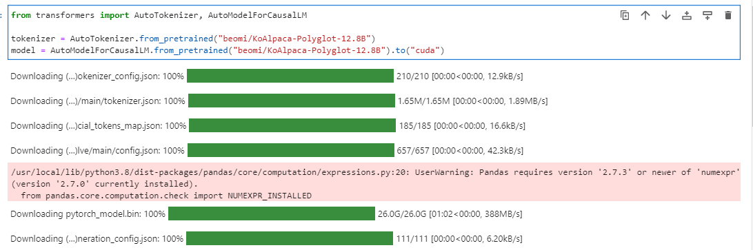 model = AutoModelForCausalLM.from_pretrained("beomi/KoAlpaca-Polyglot-12.8B").to("cuda")