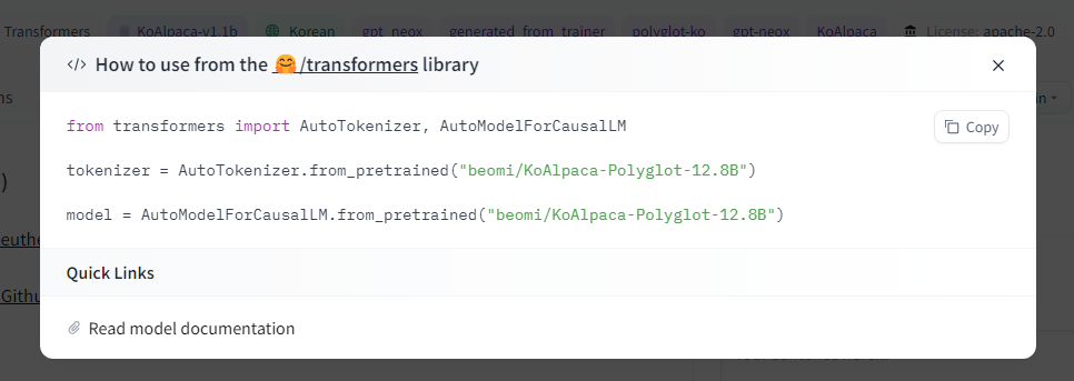 Beomi/KoAlpaca 깃헙에 나와있는 모델 중, 사용하고자하는 모델을 클릭하면 huggingface 사이트로 이동됩니다.