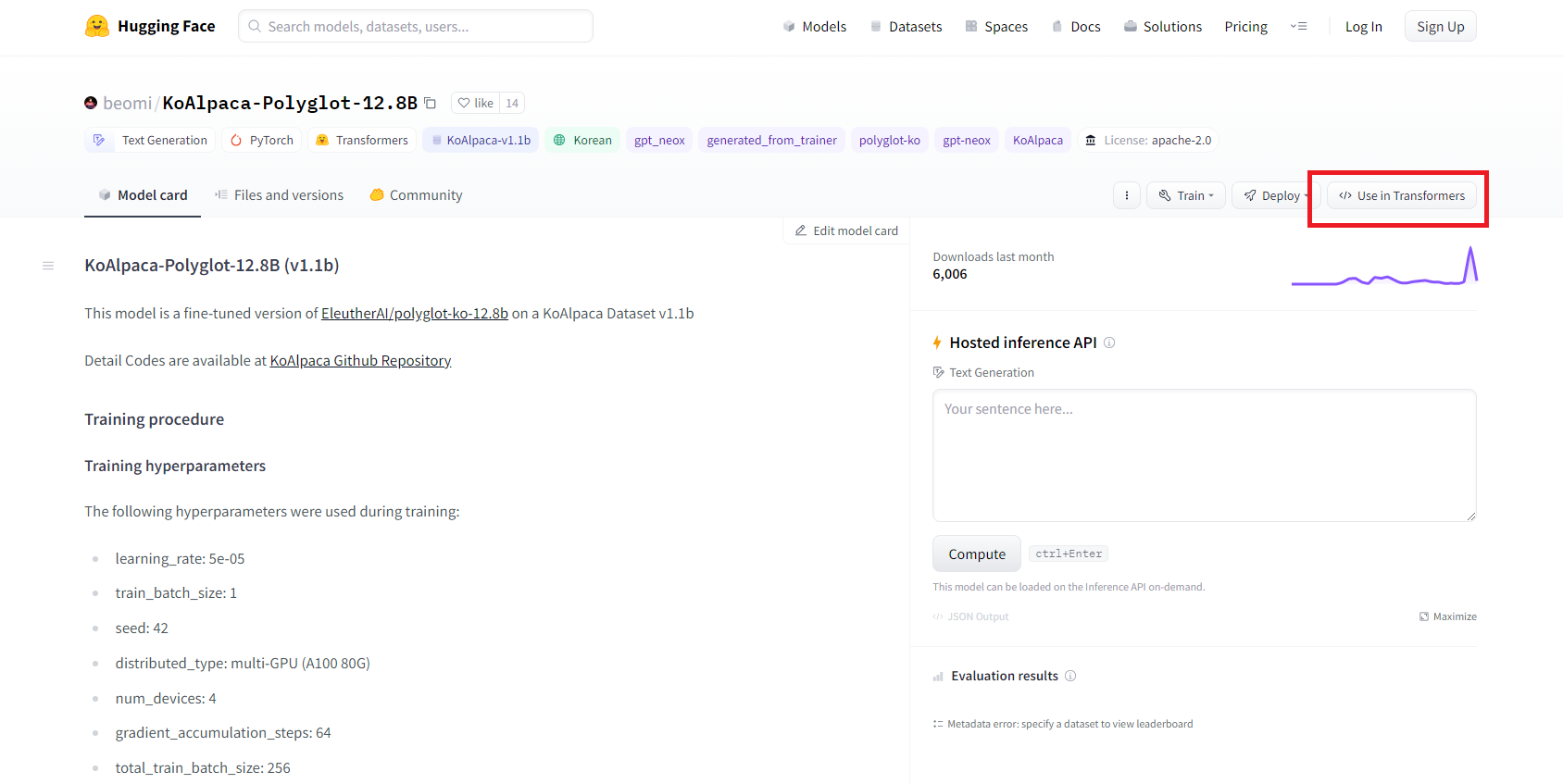 이번 편에서는 한국어버전 GPT인 beomi/KoAlpaca-Polyglot을 사용해보려고 합니다.