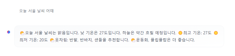 오늘 서울 날씨 어떠냐고 물어보니 이모티콘까지 써가며 자세히 답변해주고..!!