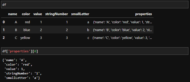 아래와 같은 데이터프레임이 있다고 했을 때, 프레임안에 있는 컬럼을 properties라는 딕셔너리 안에 담아서 새로 컬럼을 생성하도록 하는 방법입니다.
