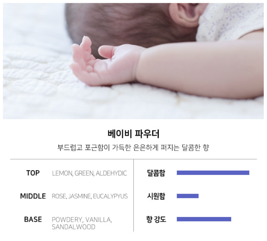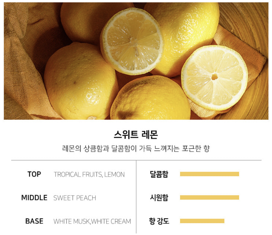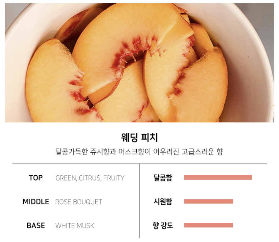 블랙체리, 클린코튼, 스위트레몬, 피톤치드, 웨딩피치, 베이비 파우더 이렇게 총 6가지의 향이 있고
