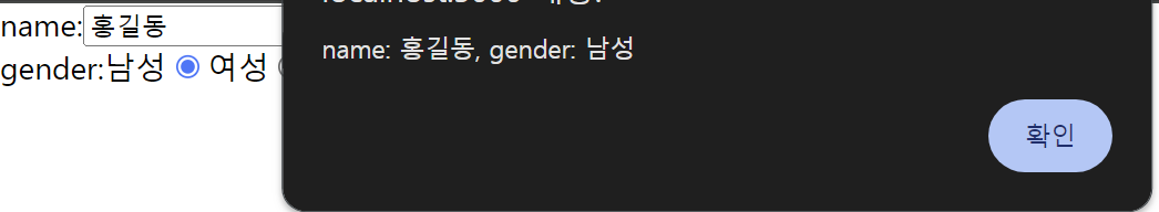 alert로 이름과 성별을 출력해주도록 하는 소스입니다.