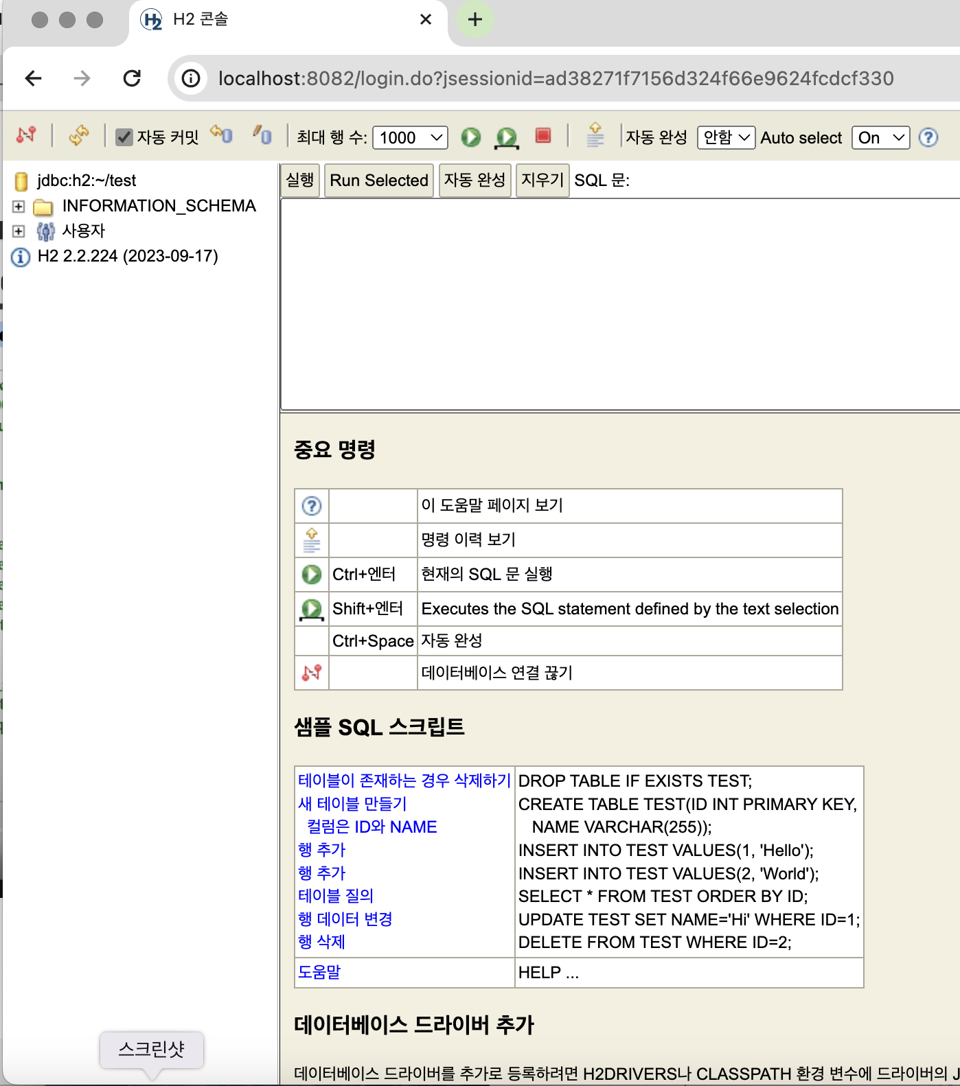 그러면 이렇게 h2 콘솔이 뜨는데요, 이대로 연결 버튼을 눌러봅니다.