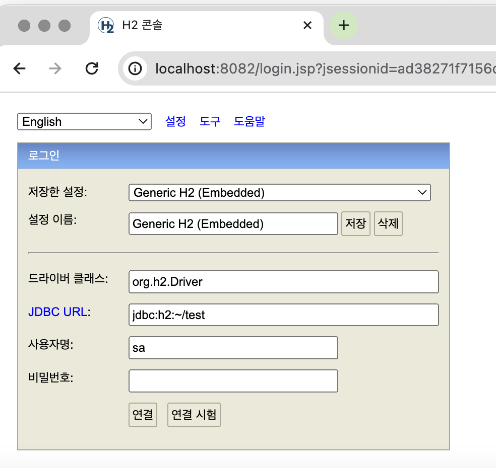 JDBC URL에 적힌 jdbc:h2:~/ 다음에 있는 "test"가 DB명이 됩니다.