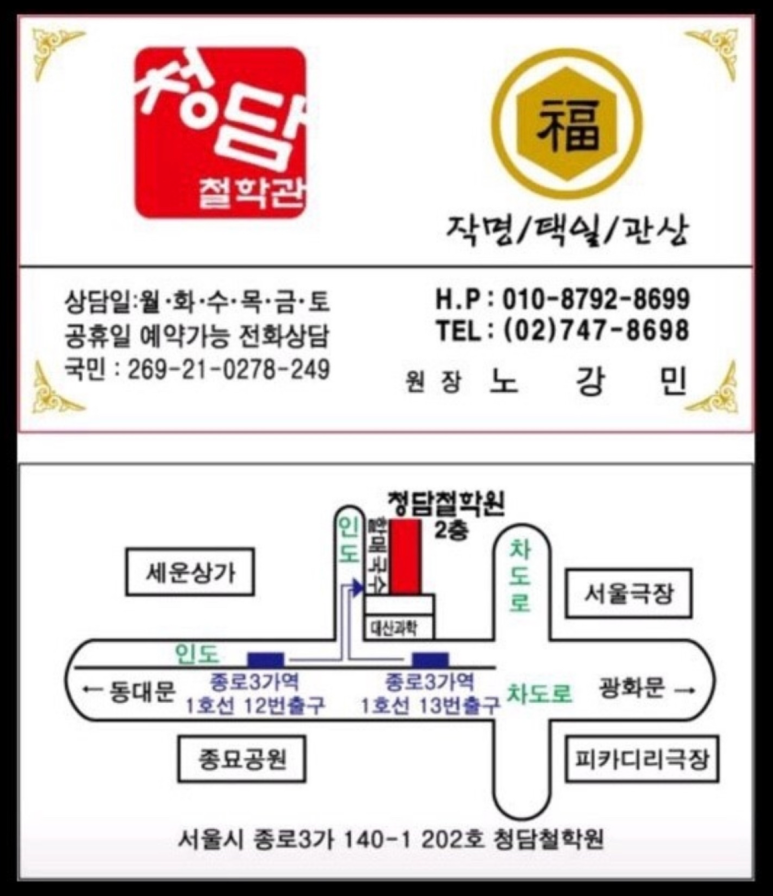 청담철학관은 종로3가역 12번, 13번 출구 바로앞에 있으며 , 예약방문 필수입니다!