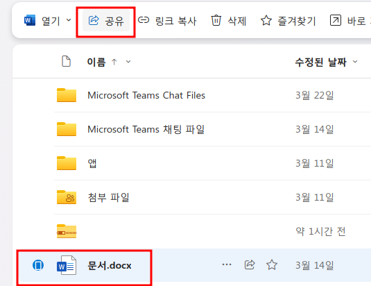 공유하고자 하는 파일 또는 폴더를 선택한 후 상단에 있는 공유버튼을 눌러주세요.